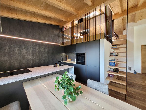 360° Aussicht und Planung im Loft in Seis am Schlern. Modern und doch gemütlich! Dunkle Details und die Küche in anthrazit in Kombination mit Eiche massiv verleiht der Wohnung einen warmen Charakter.
